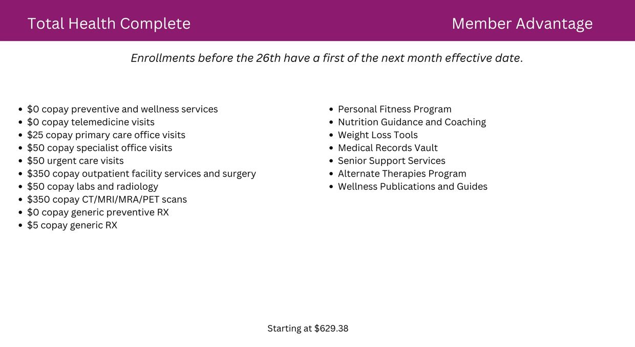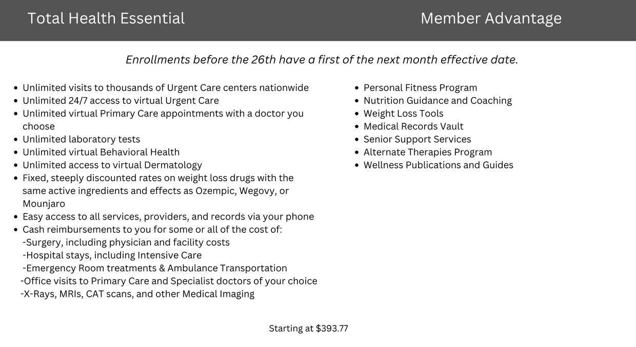 Total Health is an innovative and efficient way to gain health benefits that combine the latest technological and service access advancement in health care with a structure used by over 160 million Americans.